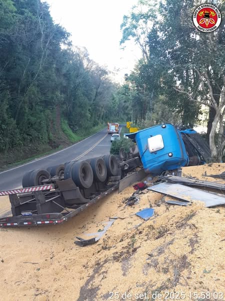CAMINHÃO APRESENTA PANE MECÂNICA, SAI DA PISTA E CAPOTA NA SC-464. Um caminhão ficou destruído…