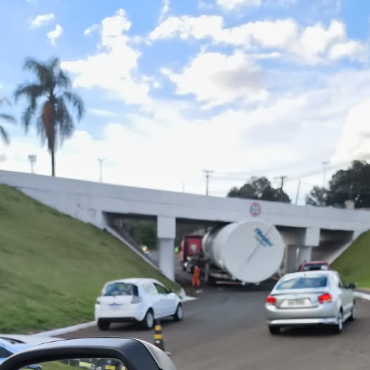 Tarde de domingo e caminhão fica preso no viaduto do Trevo do Patinho e causa congestionamento no trânsito.