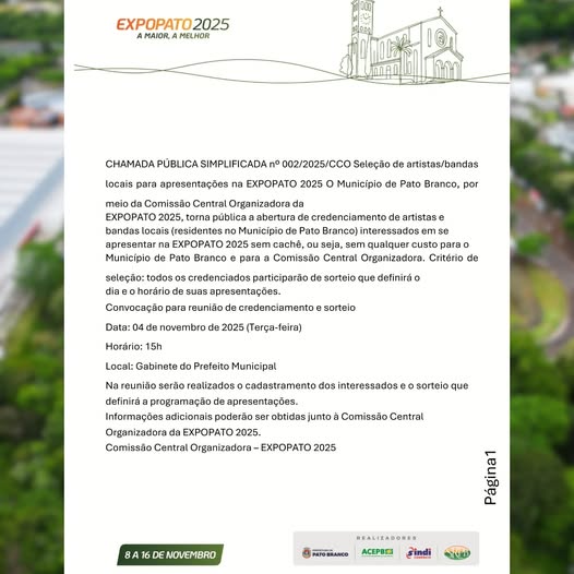 Seleção de artistas e bandas locais para a EXPOPATO 2025 O Município de Pato Branco,…