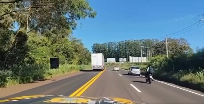 PRF flagra caminhoneiro realizando ultrapassagem perigosa em curva no Oeste do Paraná.