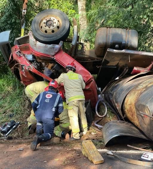 Tombamento de caminhão de leite deixa motorista gravemente ferido na PR-158.